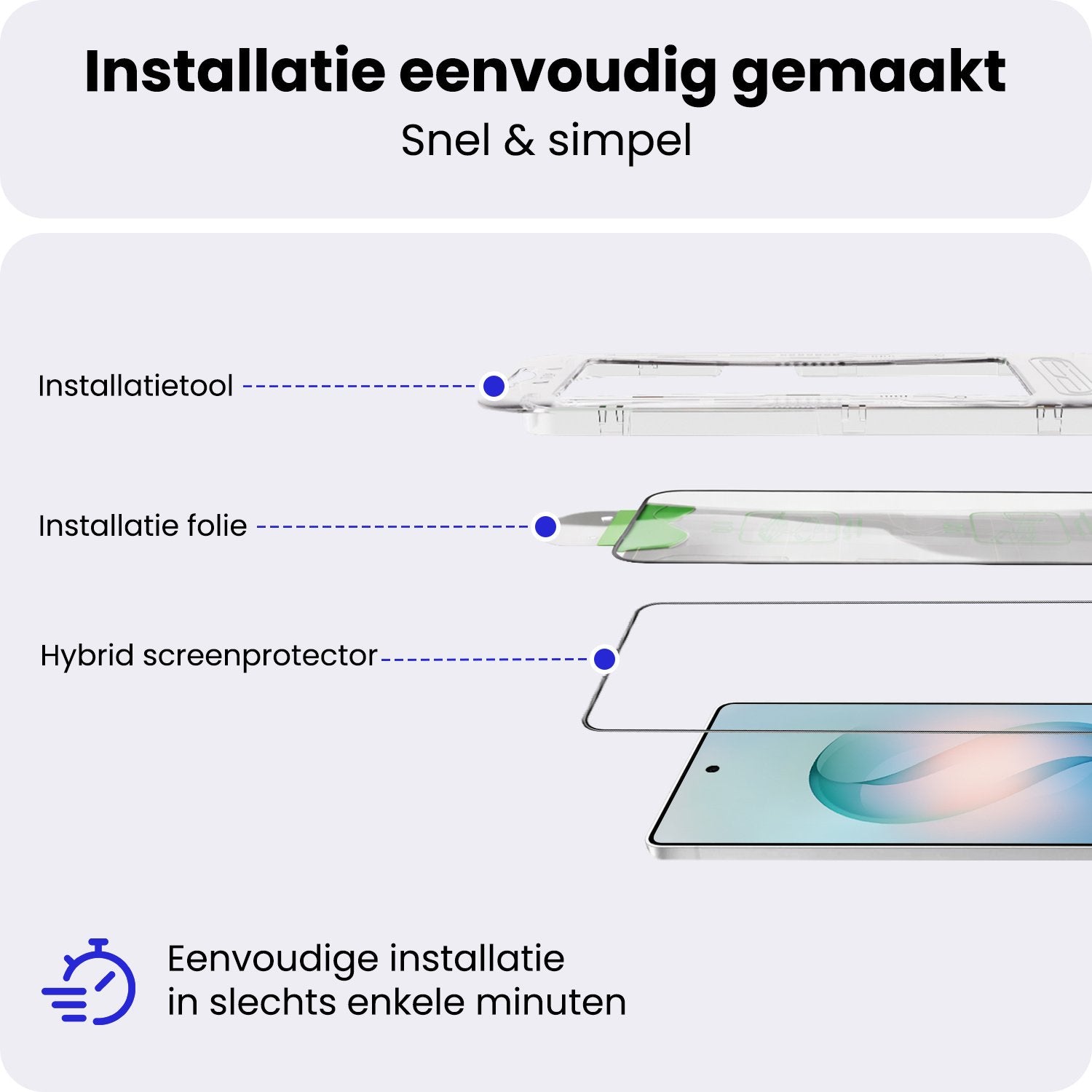 Dankzij het innovatieve hybride installatieframe plaats je de screenprotector eenvoudig en nauwkeurig op het scherm van je Samsung S26 Ultra. Geen last meer van luchtbellen of een scheve uitlijning – het frame zorgt voor een foutloze plaatsing, zelfs als je geen ervaring hebt met screenprotectors.