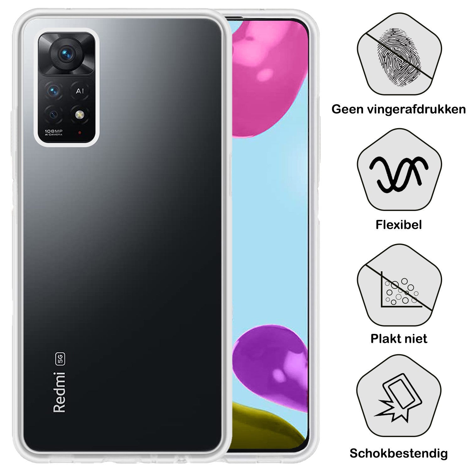 Dit hoesje is verkrijgbaar in verschillende kleuren, zodat je eenvoudig een stijl kiest die bij je past. Ga voor een neutrale tint voor een subtiele look of kies een opvallende kleur om je Xiaomi Redmi Note 11s een persoonlijke touch te geven. Voor wie het originele design van de telefoon wil behouden, is er ook een transparante variant beschikbaar.